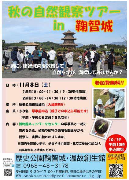 歴史公園鞠智城・温故創生館では、春と秋の2回、博物館ネットワークセンターと連携し、自然観察ツアーを実施しています。春に続き2回目となる秋の自然観察ツアー in 鞠智城を、11月8日(土)に実施します。